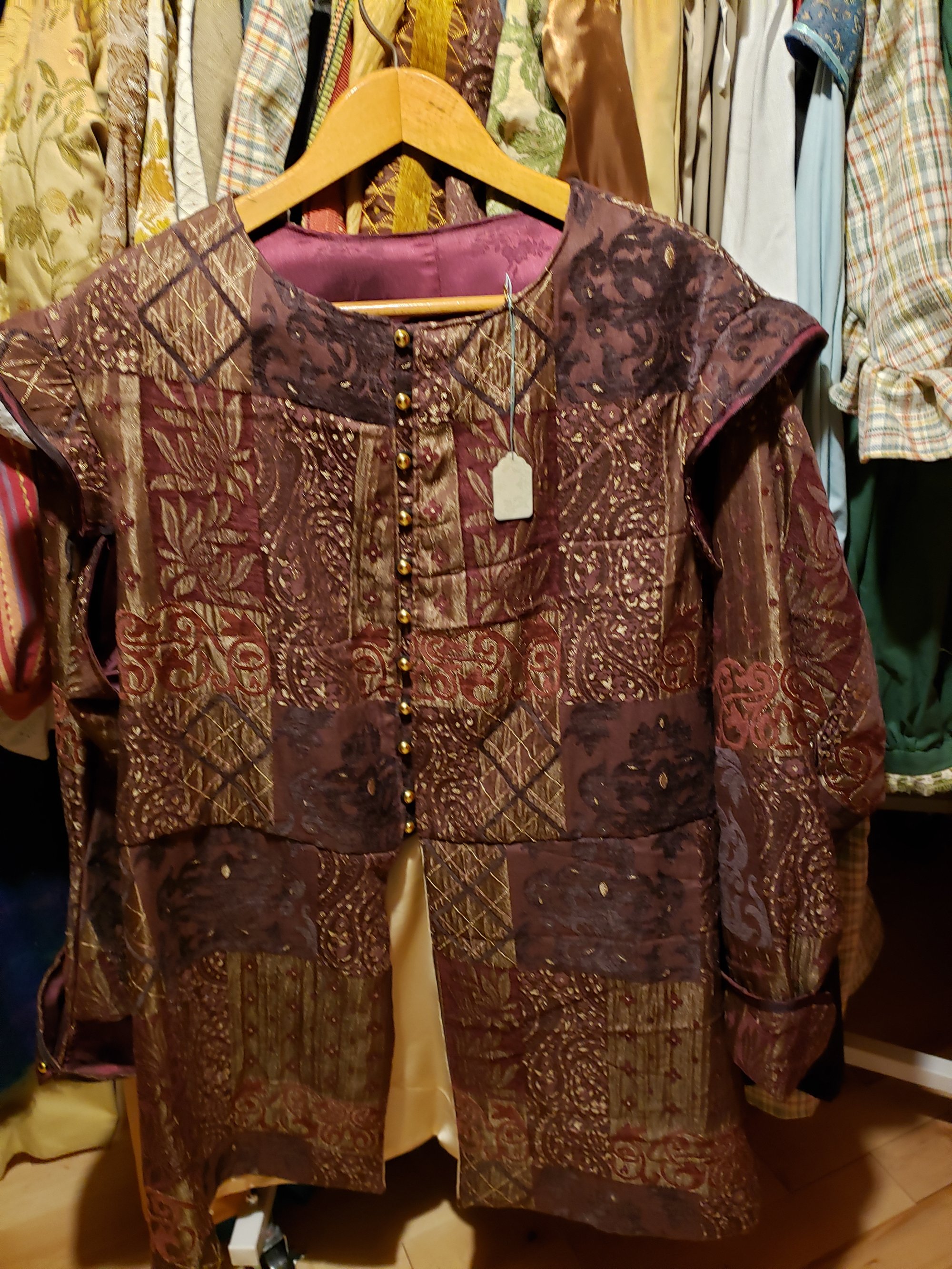 Size Lg. 42-44 , Maroon with gold colored buttons lined with satin. Removable sleeves.