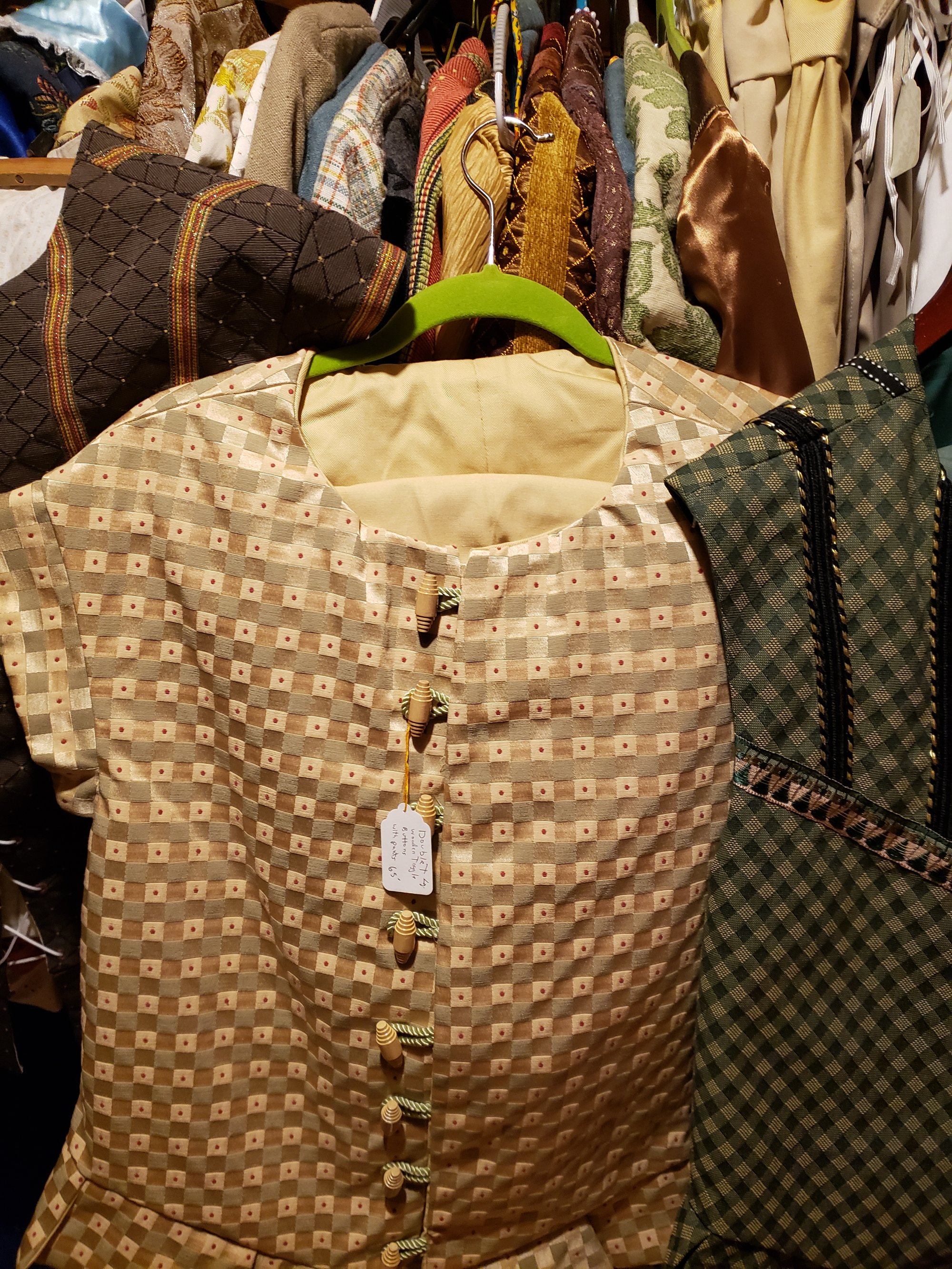 Lined doublet , wooden buttons on front Size Lg 42-44. Pants button also button but with different buttons. the pants come slightly below the knee. (elastic, can be changed to ribbon if you prefer)